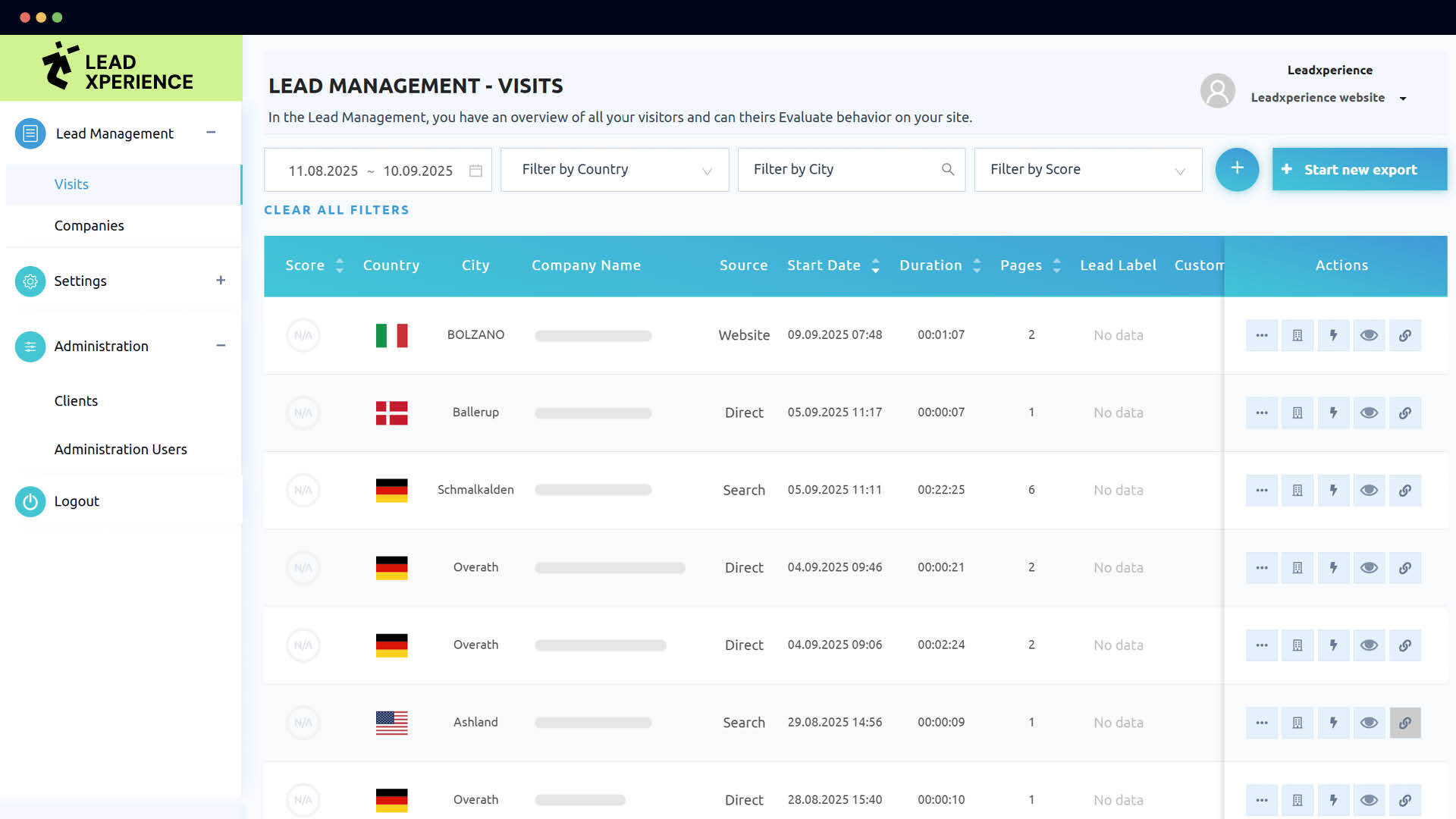 Dein Vorteil: Du erhältst alle wichtigen Details wie Firmenname, Branche, Interesse, Verhalten, Lead-Score und Besuchsdauer übersichtlich auf einen Blick und hebst damit deinen Vertrieb auf ein neues Level.